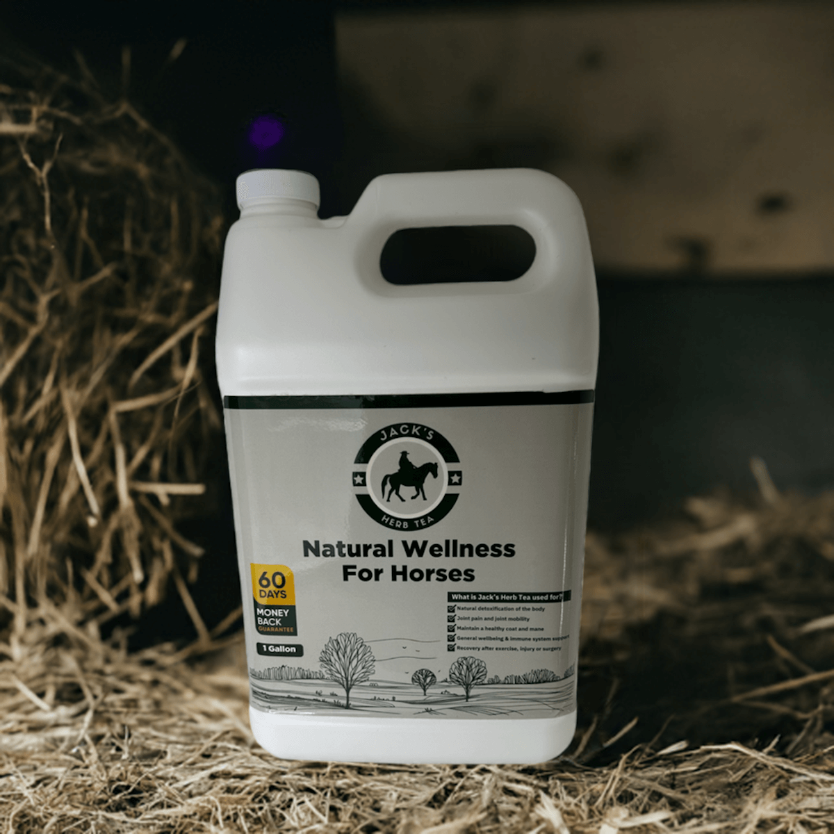 Introducing Jack's Herb Tea for Horses - a natural and effective solution for equine health. Our herbal tea is carefully crafted with 32 premium herbs, including alfalfa, garlic, rosehips, kelp, and echinacea, along with the added benefits of colloidal silver. This powerful blend works to eliminate toxins to allow natural regeneration, resulting in stronger hooves, a healthier coat, and improved overall health. Jack's Herb Tea is suitable for horses of all ages and can reduce the need for costly treatments and maintenance. Our horses haven't had to be wormed in 20 years! Give your horse the gift of natural and long-lasting health with Jack's Herb Tea for Horses.